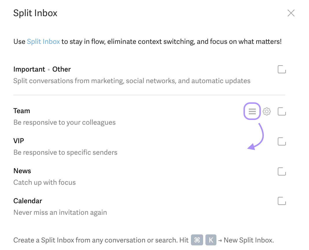 - Hit Cmd+K or Ctrl+K → Split Inbox and name your Split.