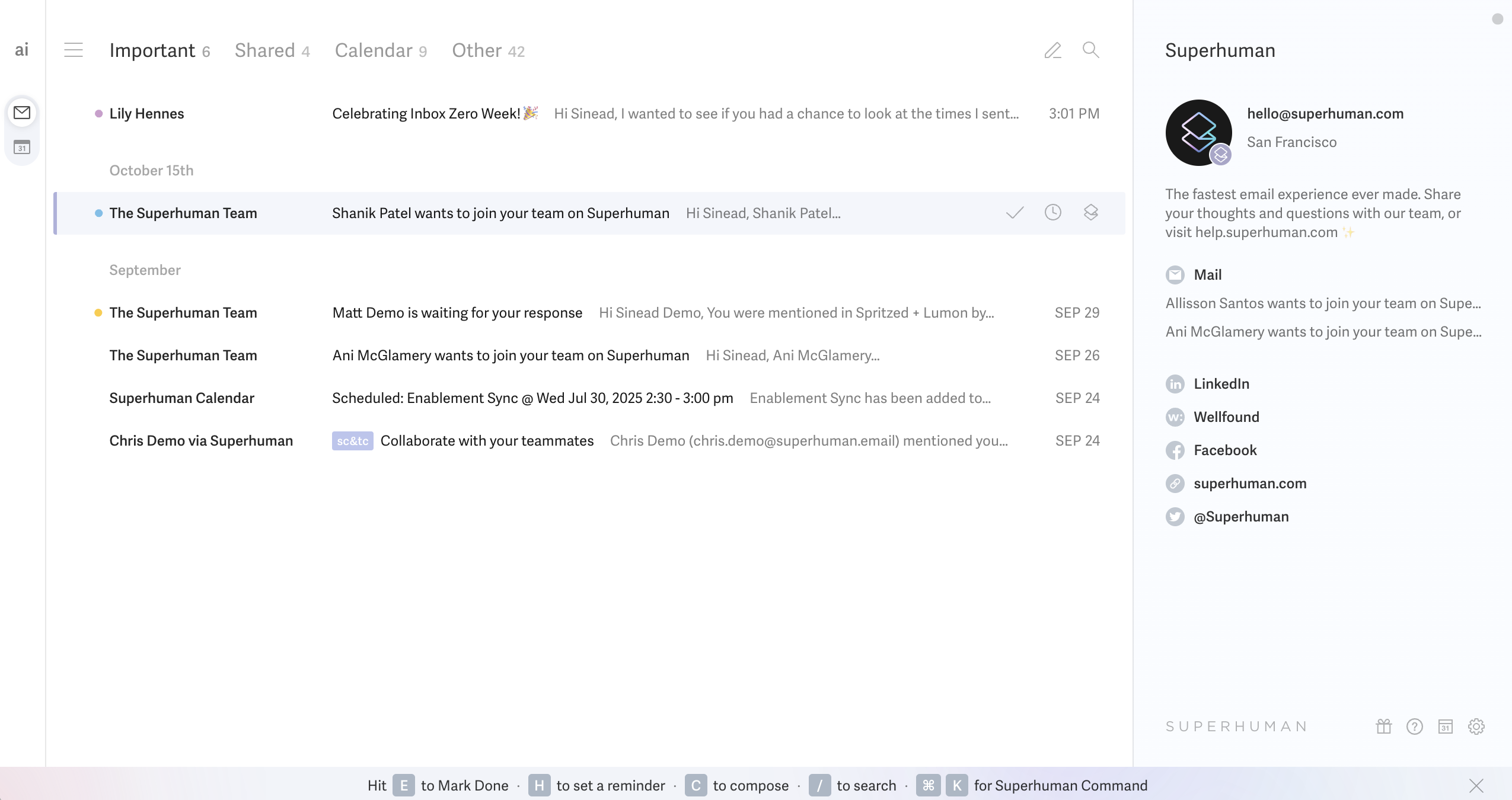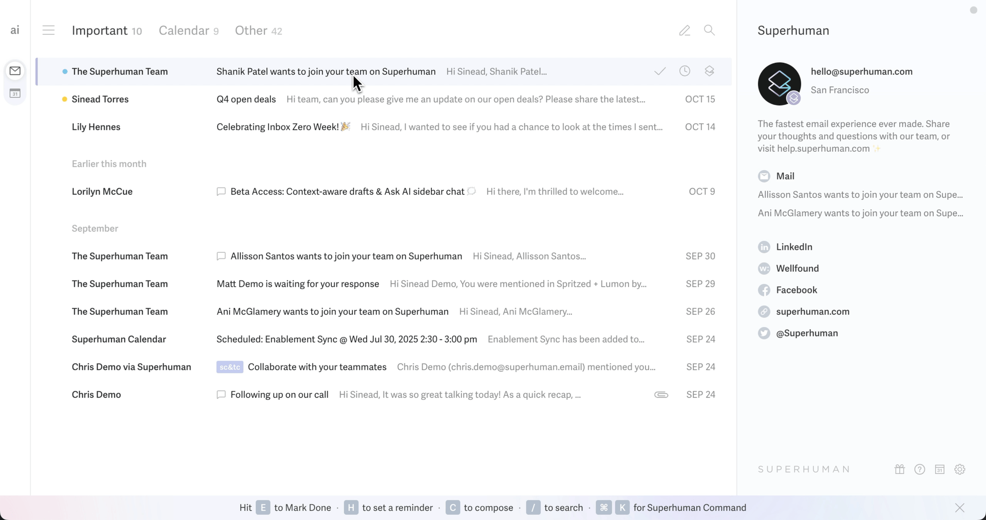 Now that you’re familiar with Superhuman Command and have practiced a few shortcuts, let’s learn how to navigate the interface using quick keyboard shortcuts.