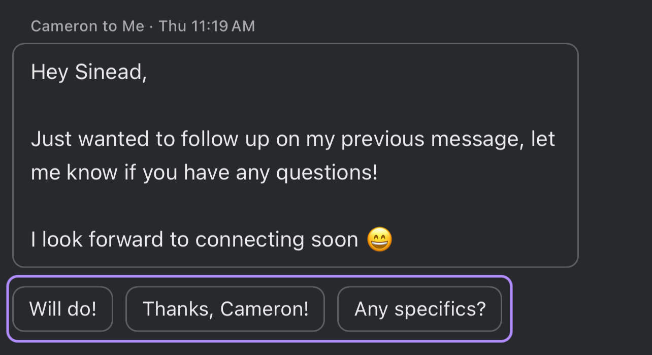 Instant Reply appears similarly on mobile! We show three draft replies at the bottom of the latest message. To insert the reply, tap the response you'd like to use.