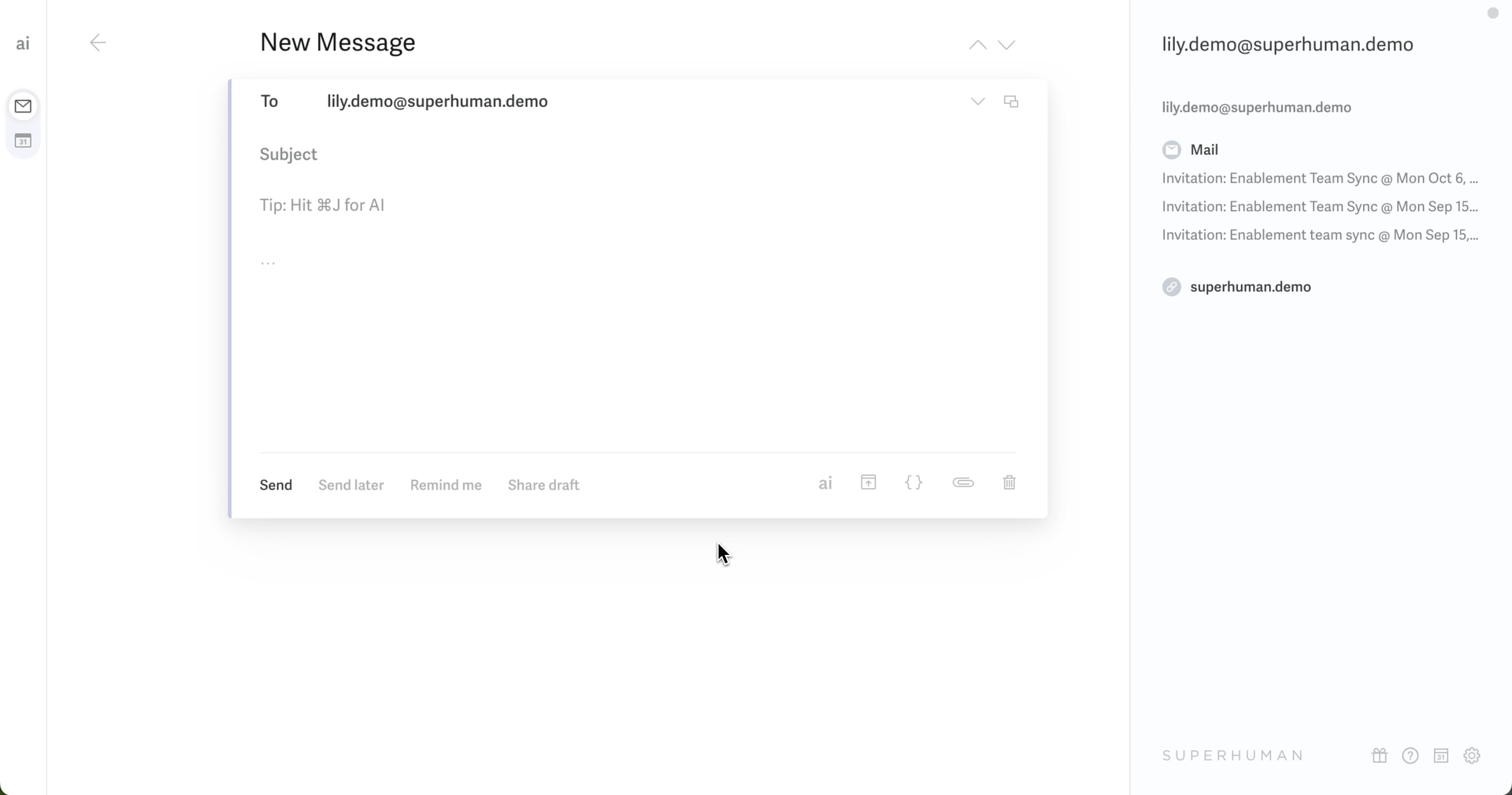 When drafting a message, hit Cmd+J (Mac) or Ctrl+J (Windows) to write with AI. Then, type a prompt and hit Enter to have Superhuman AI draft a message. The more context and keywords you include, the more specific the drafted message will be.
