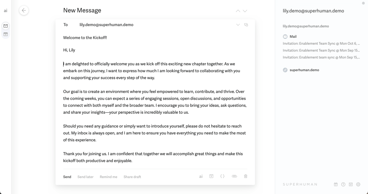 Turn ideas into polished messages in seconds. Superhuman AI helps you draft clear, compelling emails that sound like you without the extra effort.