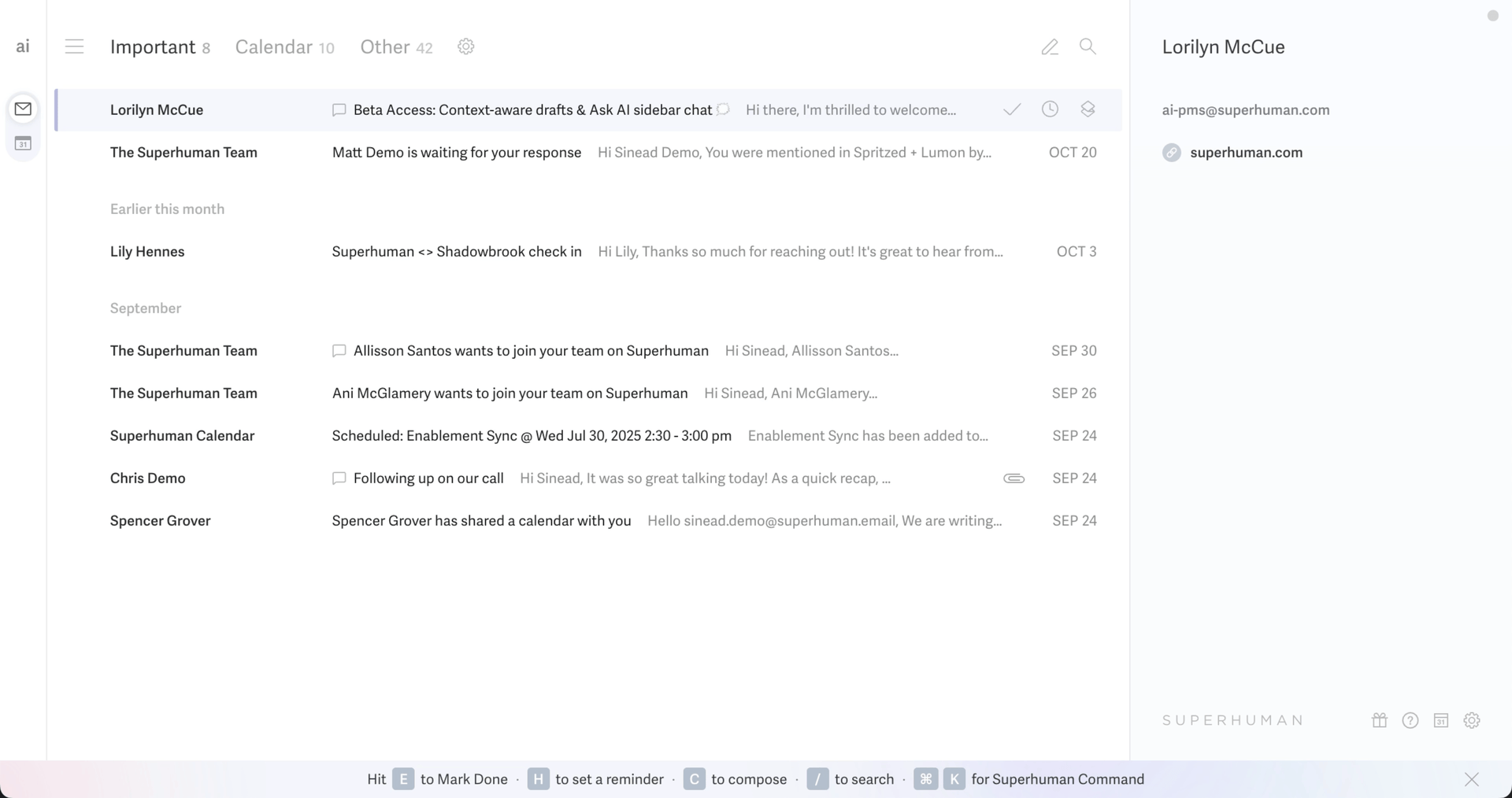 Once you’ve finished an email, mark it Done in Superhuman Mail instead of leaving it read in your inbox.