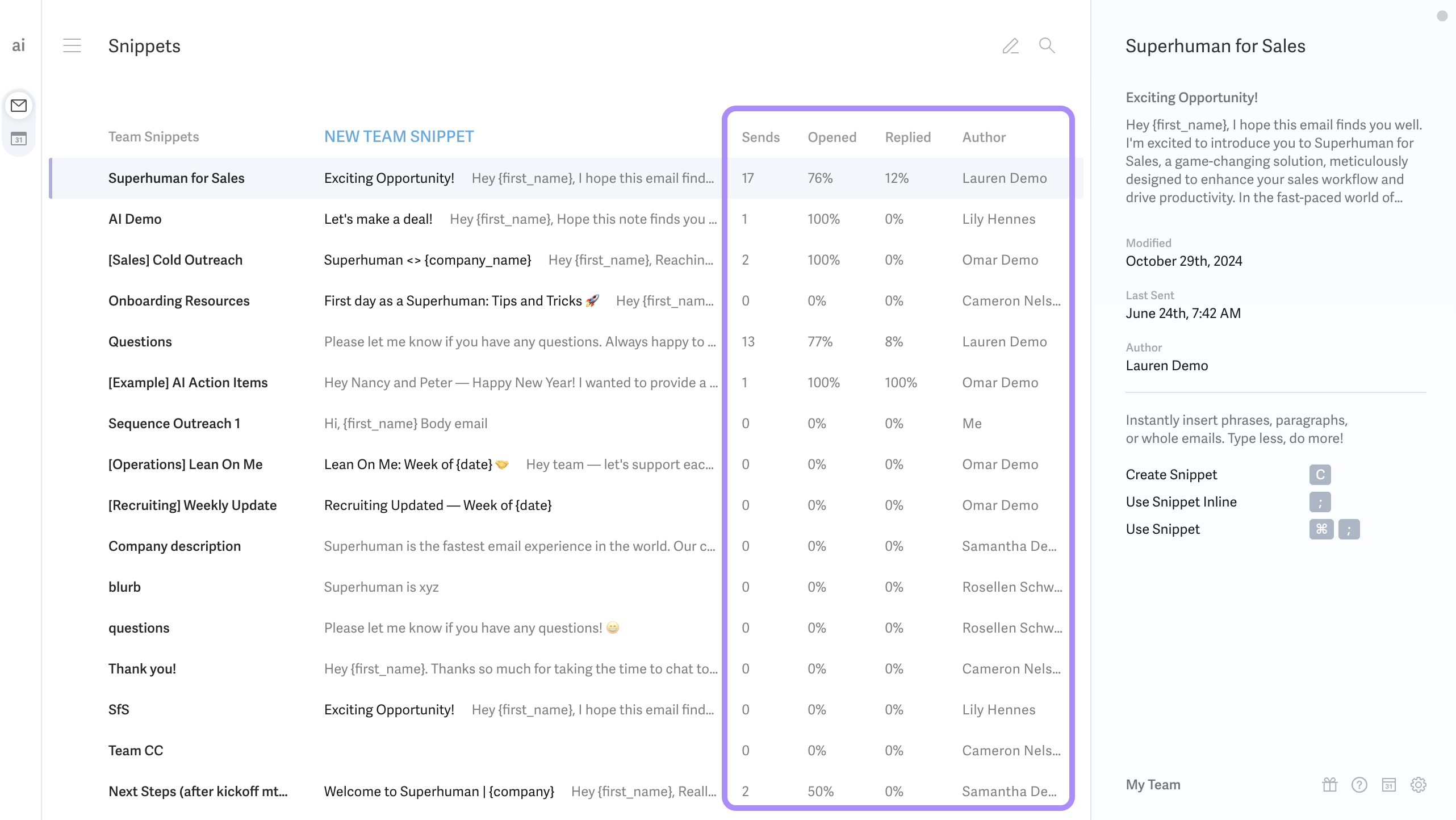 The number of sends, the open and response rates, and the author of the Snippet, will display beside each Snippet.