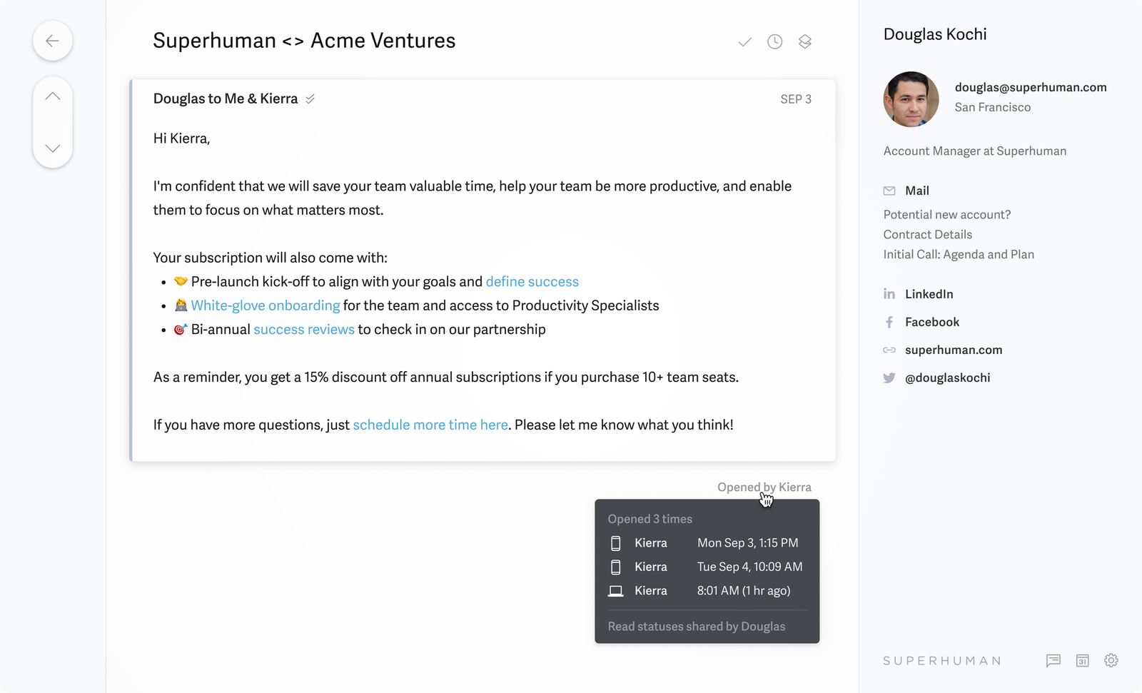 See contacts, leads, accounts, and opportunities right within your inbox by integrating your Salesforce, HubSpot, or Pipedrive account.